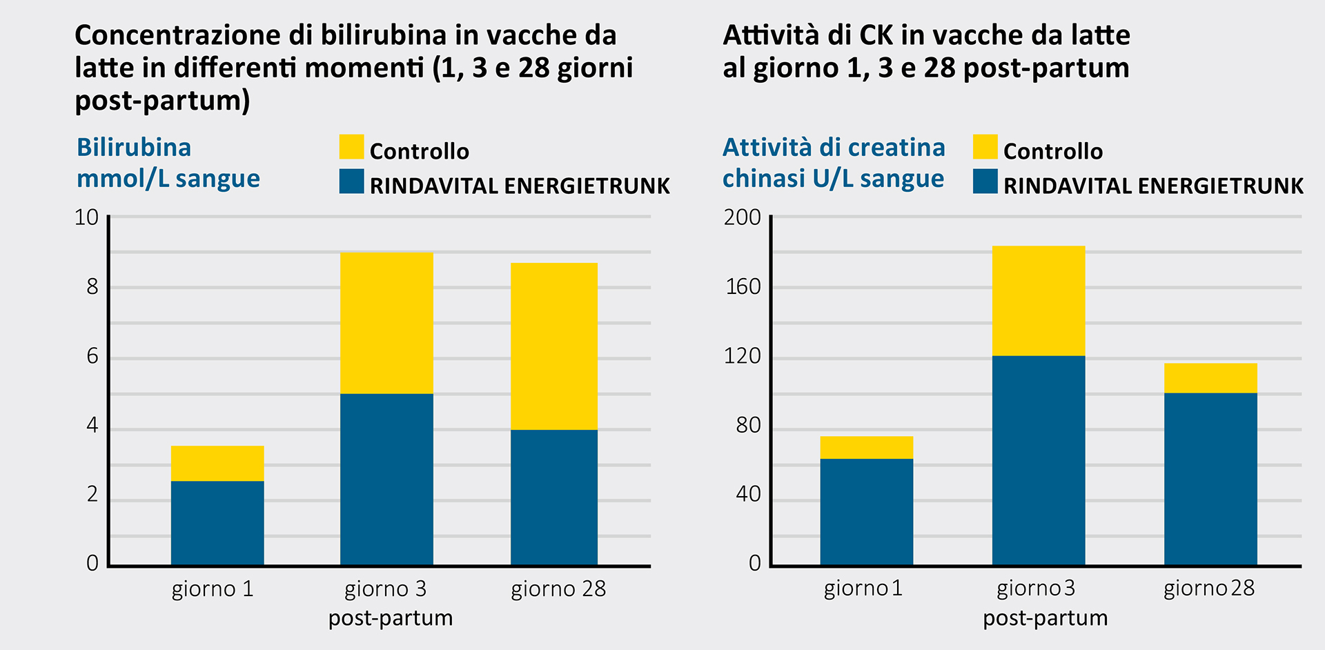 La concentrazione di bilirubina nel sangue è un ottimo indicatore per gli stati di carenza acuta di energia nella vacca con conseguente affaticamento del fegato. Le vacche che hanno ricevuto RINDAVITAL ENERGIETRUNK hanno mostrato un livello di bilirubina nel sangue nettamente inferiore e,